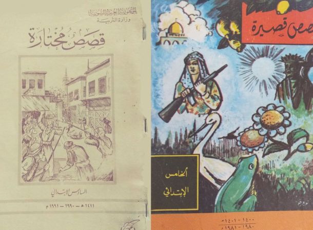 في الصورة غلاف كتاب «قصص قصيرة» للصف الخامس الابتدائي «1980-1981» وغلاف كتاب «قصص مختارة» للصف السادس الابتدائي «1990-1991». يحتوي الغلاف الأول صورة فدائي فلسطيني، ويحتوي الثاني صورة معركة من معارك الثورة السورية الكبرى في دمشق. هل كانت المناهج القديمة أفضل من المناهج الحالية؟