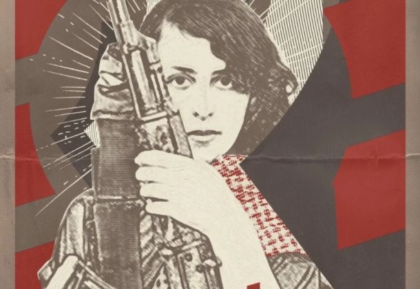 ملصق حول يوم المرأة العالمي يُظهر المرأة الفلسطينية تحمل سلاح المقاومة في وجه المحتل الصهيوني تحت شعار: «المرأة غرس الأرض ونبض الثورة»