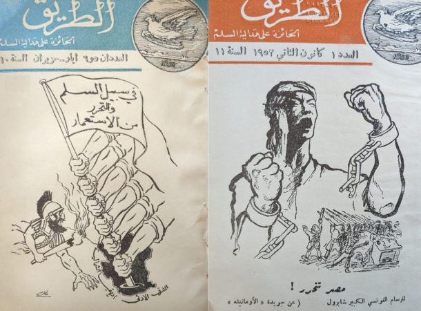 شعوب الشرق وإفريقيا الشمالية تنهض من أجل السلم والتحرر من التبعية الاستعمارية، ولوحة (مصر تتحرر) للرسام الفرنسي شابرول؛ نماذج من رسومات غلاف الصفحة الأولى من المجلة الحائزة على ميدالية السلم، مجلة الطريق عام 1952.