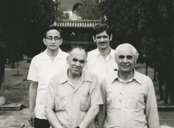 بدأت العلاقات الصينية مع البلدان العربية في النصف الثاني في خمسينيات القرن العشرين، وشملت في جزء منها العلاقات الثقافية التي كان من أبرز نقاطها انتشار الكتب الصينية في البلدان العربية ومنها سورية. ومن ناحية أخرى، عاش العديد من الكتاب السوريين في الصين منذ تلك الفترة مثل الروائي الراحل حنا مينة. في الصورة: الكاتبان عبد المعين الملوحي (حمص) وسلامة عبيد (السويداء) أمام أحد القصور الأثرية الصينية عام 1975 أثناء عملهم في الصين. ونشر الاثنان مجموعة من الأعمال المكتوبة والمترجمة عن الثقافة الصينية.