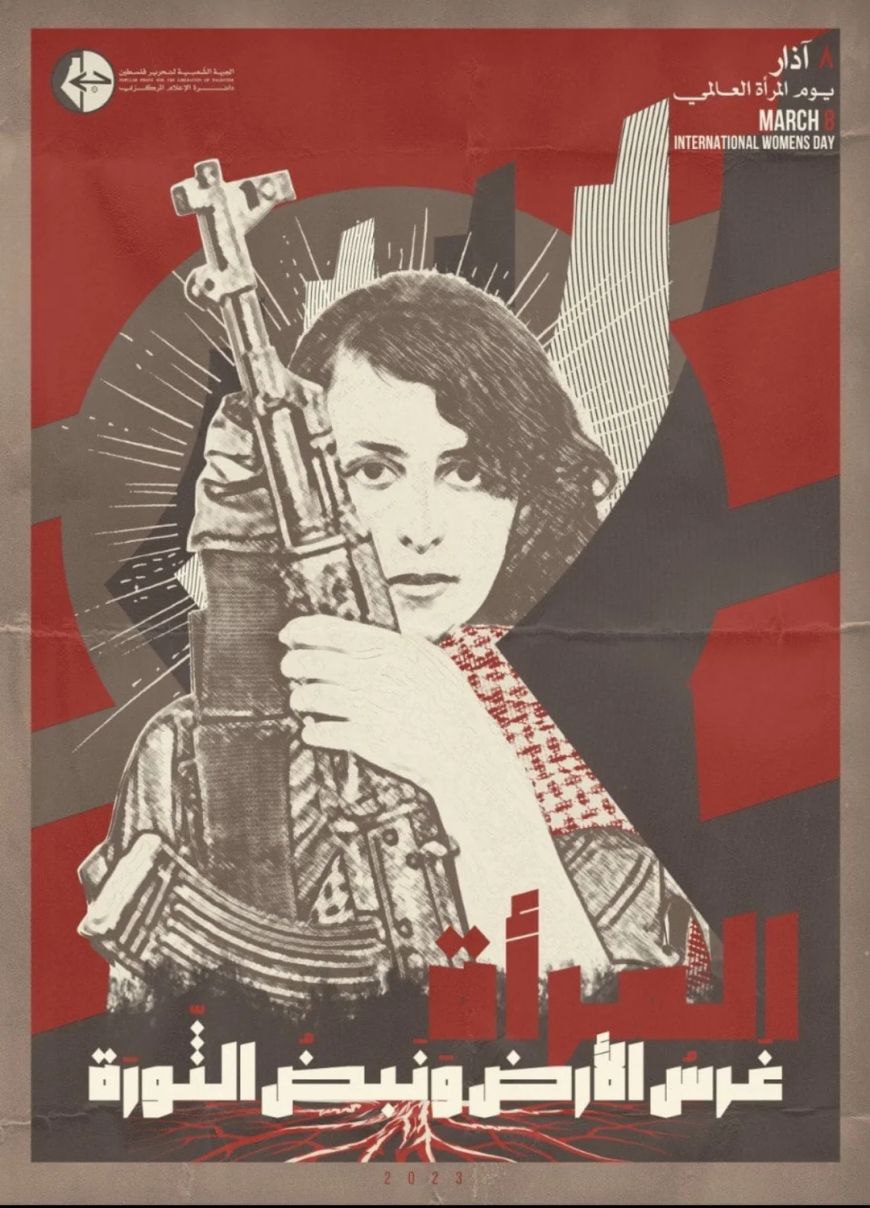 ملصق حول يوم المرأة العالمي يُظهر المرأة الفلسطينية تحمل سلاح المقاومة في وجه المحتل الصهيونيتحت شعار: «المرأة غرس الأرض ونبض الثورة»