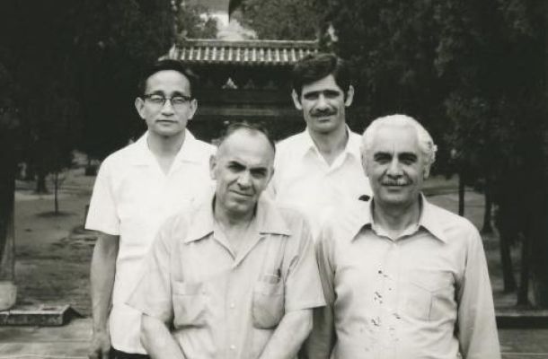بدأت العلاقات الصينية مع البلدان العربية في النصف الثاني في خمسينيات القرن العشرين، وشملت في جزء منها العلاقات الثقافية التي كان من أبرز نقاطها انتشار الكتب الصينية في البلدان العربية ومنها سورية. ومن ناحية أخرى، عاش العديد من الكتاب السوريين في الصين منذ تلك الفترة مثل الروائي الراحل حنا مينة. في الصورة: الكاتبان عبد المعين الملوحي (حمص) وسلامة عبيد (السويداء) أمام أحد القصور الأثرية الصينية عام 1975 أثناء عملهم في الصين. ونشر الاثنان مجموعة من الأعمال المكتوبة والمترجمة عن الثقافة الصينية.
