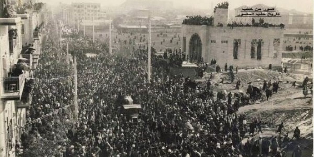 صورة تظهر جنازة إبراهيم هنانو (المناضل ضد الاحتلال الفرنسي)  في حي الجميلية في حلب في العام 1935