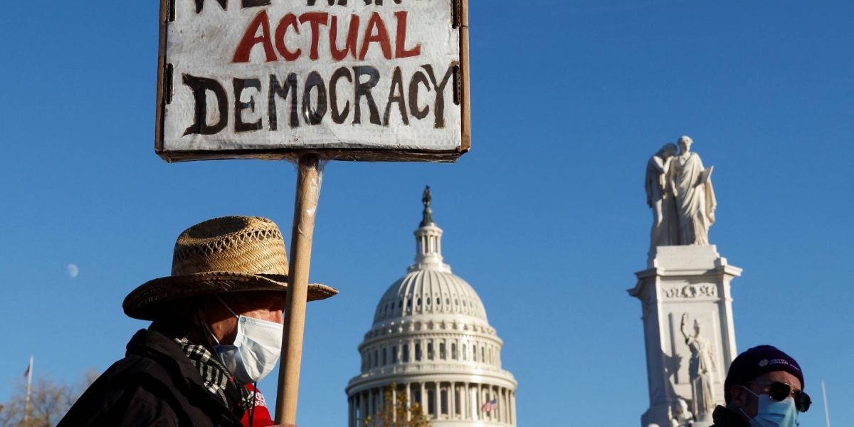(الولايات المتحدة ليست ديمقراطية ولم تكن كذلك قَطّ)، بهذه الحقيقة عَنوَن الباحث غابرييل روكهيل مقالاً سابقاً كتبه لموقع (كاونتربانش) عام 2017، حيث علّق فيه على مَن يتباكون على ما يسمّى (خسارة الديمقراطية) في الولايات المتحدة. ويعلّل روكهيل ردّ فعل هؤلاء المخدوعين بأنّه يرجع في جزء كبير منه إلى ما يمكن اعتباره (أنجَحَ حملة علاقاتٍ عامّة في التاريخ الحديث).