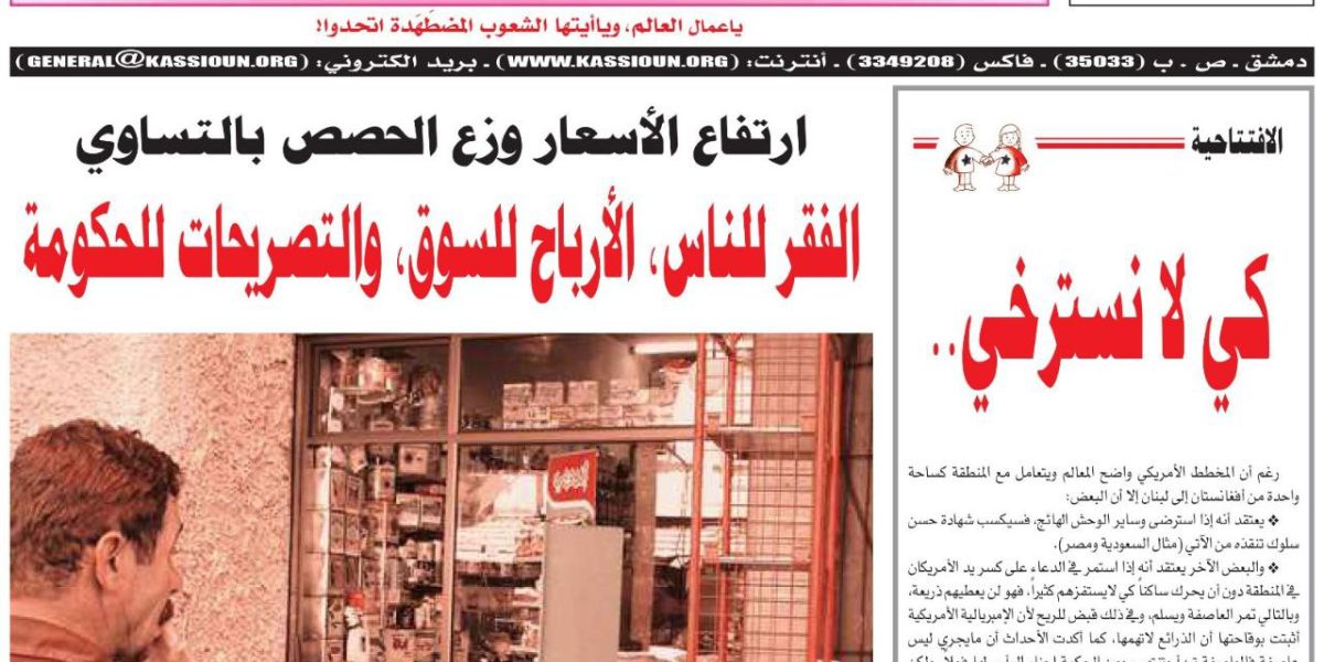 كتب على غلاف الصفحة الأولى من جريدة قاسيون العدد 264 عام 2006: ارتفاع الأسعار وزّع الحصص بالتساوي. الفقر للناس، الأرباح للسوق، التصريحات للحكومة. كم مرة ارتفعت الأسعار في السنوات الـ 15 الأخيرة؟ وأين تذهب الأرباح بينما الفقر للناس؟