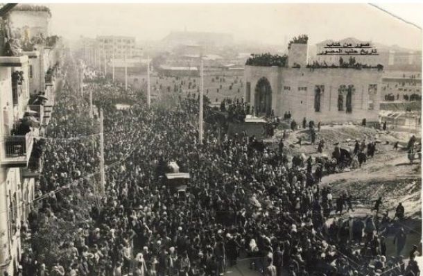 صورة تظهر جنازة إبراهيم هنانو (المناضل ضد الاحتلال الفرنسي) في حي الجميلية في حلب في العام 1935